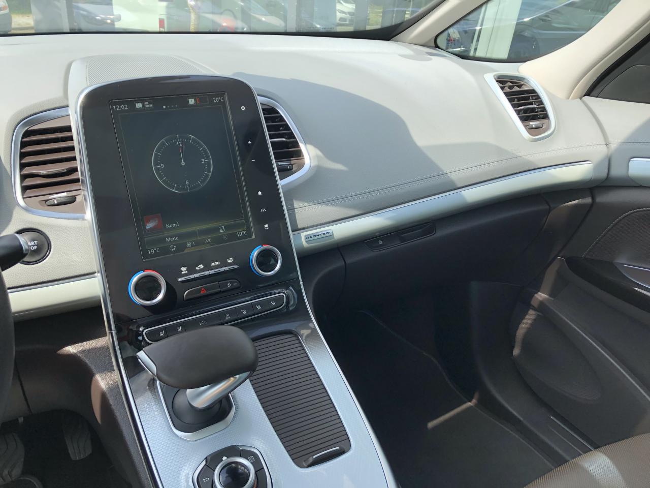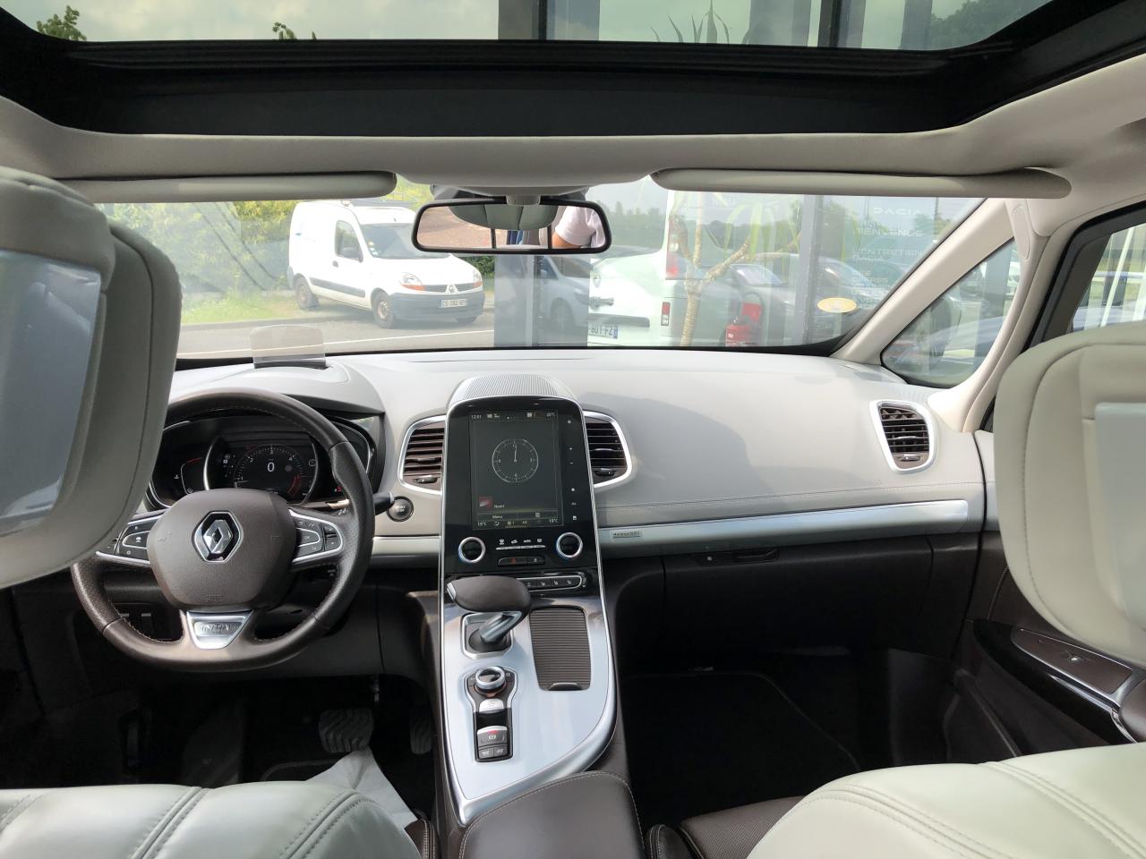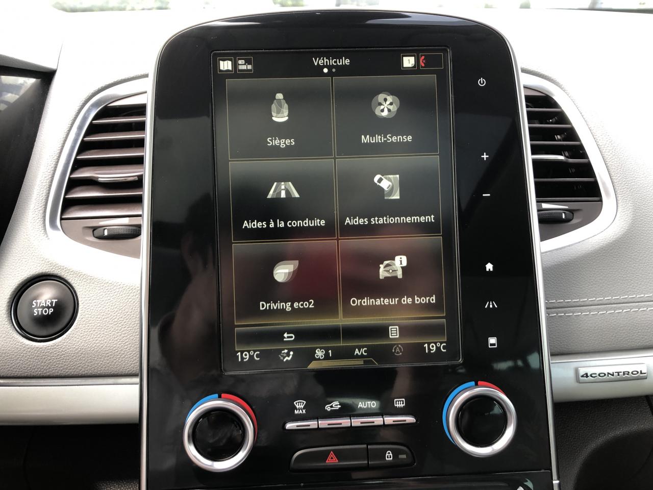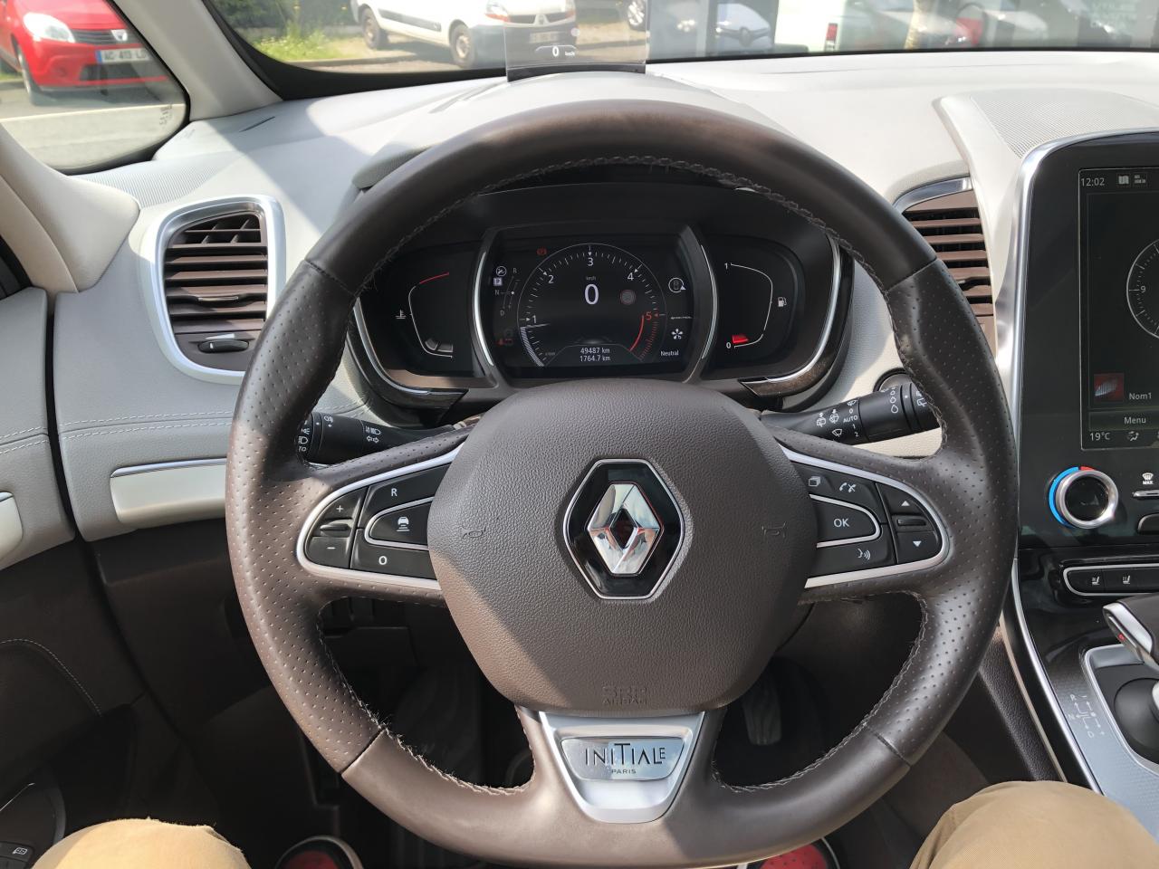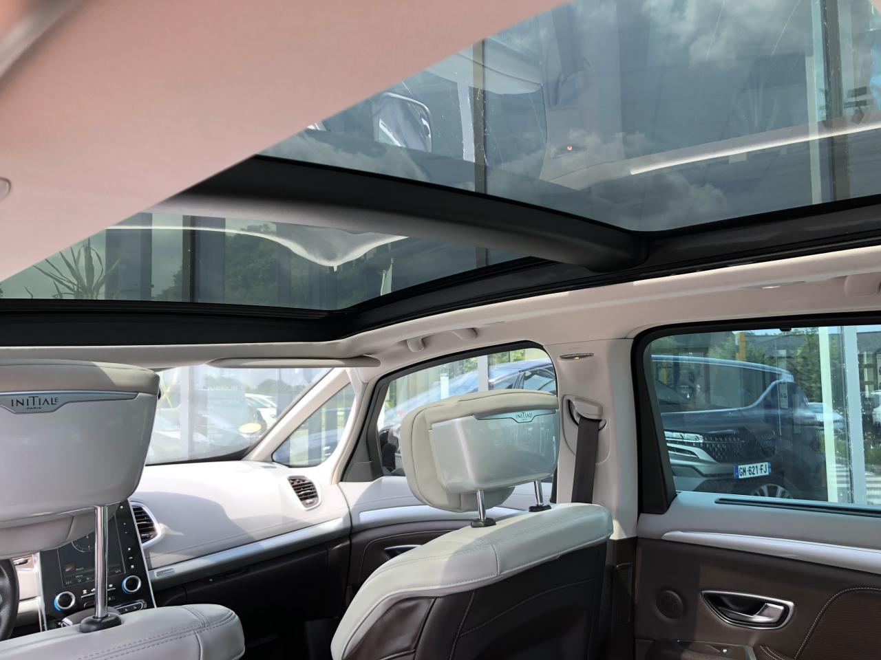 ABS avec aide au freinage d'urgenceAccoudoir central avant avec rangementAdvanced Traction ControlAérateurs aux places arrièresAide au démarrage en côteAide au parking avant, arrière et latéralAirbags frontaux conducteur et passager adaptatifs (airbag passager déconnectable)Airbags latéraux (airbag thorax et bassin à l'avant)Airbags rideaux de tête aux places avant et arrièreAllumage automatique des feux de détresse en cas de choc ou de freinage brutalAppuie-tête avant et arrière RelaxBose Surround System avec 12 haut-parleurs et Active Noise ControlCaméra de reculCapteurs de pluie et de luminositéCapteurs de toxicité (Nox/CO)Carte Renault mains-libres avec allumage des feux à l'approcheClimatisation automatique bizoneCondamnation automatique des ouvrants en roulantConsole suspendue avec rangement et éclairage d'ambianceContrôle dynamique de trajectoire (ESP)Coques de rétroviseurs extérieurs noir nacréDirection à assistance électriqueEclairage de bienvenue et ambiance lumineuseEco driving (Monitoring, Scoring, Coaching et conseils)Energy Smart Management: récupération d'énergie au freinageFeux arrières à LEDFeux de jour à LEDFeux LED Pure VisionFilm Console "Silver Wood"Filtre combinéFixations Isofix aux 3 places arrièreFrein de parking assistéJantes alliage 19" Initiale ParisKit gonflage de réparationLève-vitres avant/arrière électriques à impulsion, avec fonction antipincementMiroirs de courtoisie éclairésModularité One TouchOrdinateur de bordPack 4ControlPack CityPack SécuritéPack TechnologiePack Visio SystemPare-brise panoramique lumière avec occultation par vélumPlanche de bord gris Lune avec surpiqûres ou brun foncé avec surpiqûresPoches aumônière accessibles au rang 2Pommeau de levier de vitesse cuirPrédisposition pour alarmePrises 12 volts en rangs 1 et 2Prises USB et mini-jack rang 1 et rang 2Renault Multi-SenseRenault R-Link 2Rétroviseur intérieur jour/nuit automatiqueRétroviseurs extérieurs électriques, dégivrants, à mémoire avec sonde de température et rabattables électriquementSellerie Cuir Nappa Camaïeu Gris/BrunSièges arrière individuels (coulissants et dossiers réglables)Sièges avant électriques 10 voies à mémoire massants, ventilés, chauffants avec réglage manuel de la longueur d’assiseSon Arkamys 8 haut-parleursStores pare-soleil arrièreSurtapis de sol avant et arrière Initiale ParisSystème de surveillance de la pression des pneusSystème Stop & StartTiroir Easy-Life avec éclairage, réfrigéréVitrage latéral feuilletéVitres latérales et lunette arrière surteintéesVolant cuir Nappa réglable en hauteur et profondeur